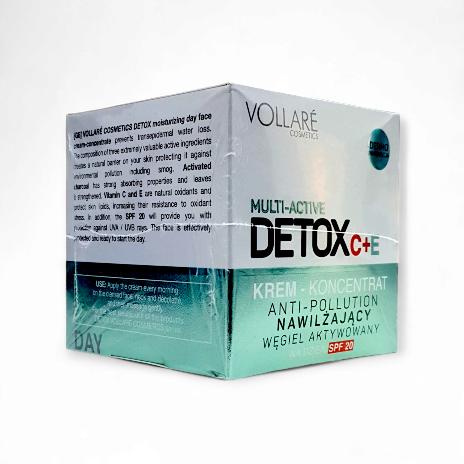 [GB] VOLLARE COSMETICS DETOX كريم ترطيب نهاري للوجه - مركز يمنع فقدان الماء عبر البشرة. تركيبة من ثلاثة مكونات فعالة للغاية تخلق حاجزًا طبيعيًا على بشرتك يحميها من التلوث البيئي بما في ذلك الضباب الدخاني. يتميز الفحم النشط بخصائص امتصاص قوية ويقوي البشرة. فيتامين C و E هما مضادات أكسدة طبيعية تحمي دهون البشرة وتزيد من مقاومتها للإجهاد التأكسدي. بالإضافة إلى ذلك، يوفر عامل الحماية من أشعة الشمس SPF 20 حماية ضد أشعة UVA /UVB. يتم حماية الوجه بشكل فعال ويصبح جاهزًا لبدء اليوم. E SPF 20